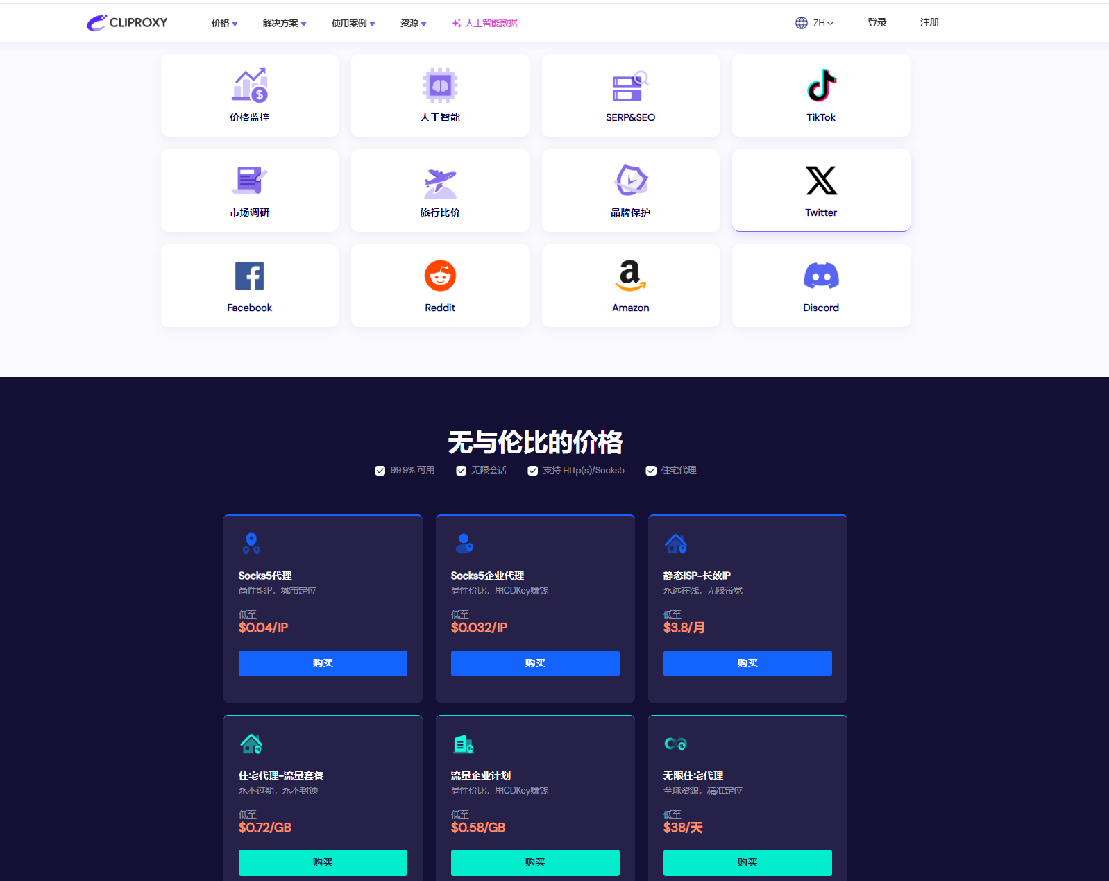 Cliproxy 在核心服务单价上具备显著优势,尤其针对高频使用的 Socks5 代理 IP,单价低至 0.032 美元 / IP。