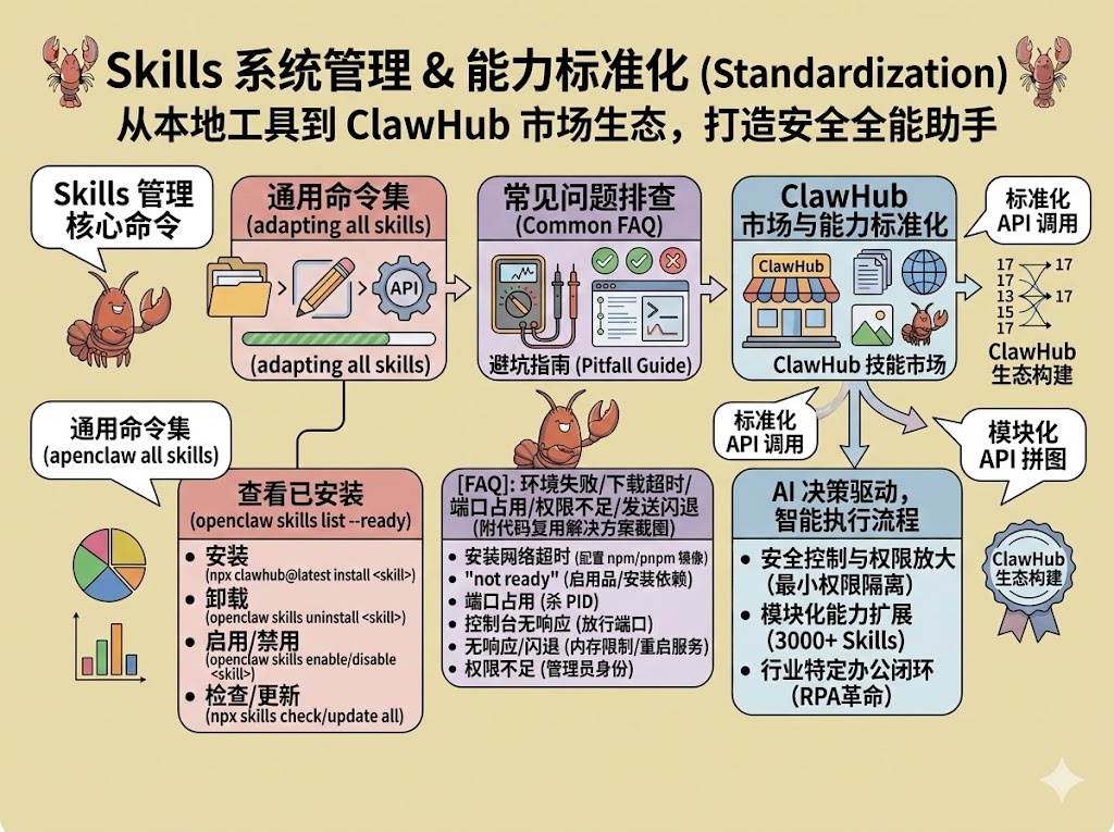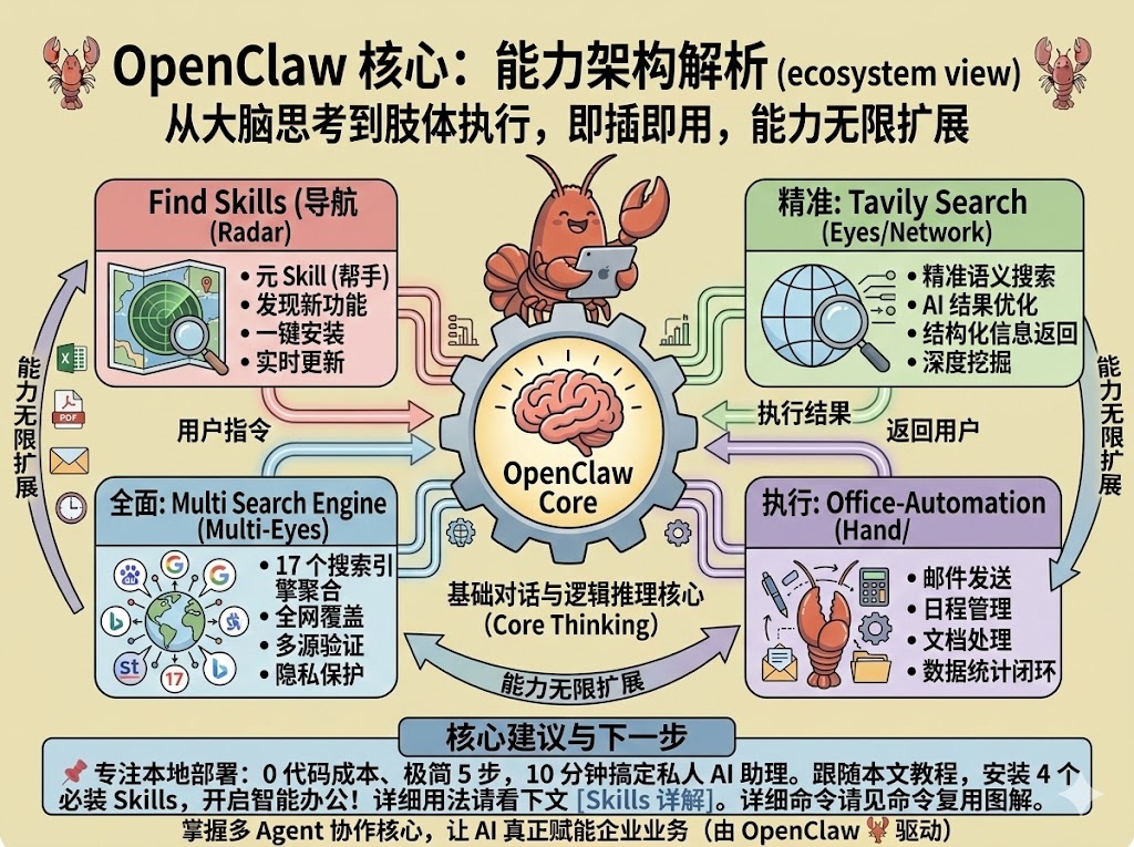 如果允许 AI 随意执行任何命令,一旦 AI 被恶意提示注入或出现逻辑错误,后果将不堪设想。因此,OpenClaw 通过技能系统(Skills)对 AI 的能力进行严格控制。