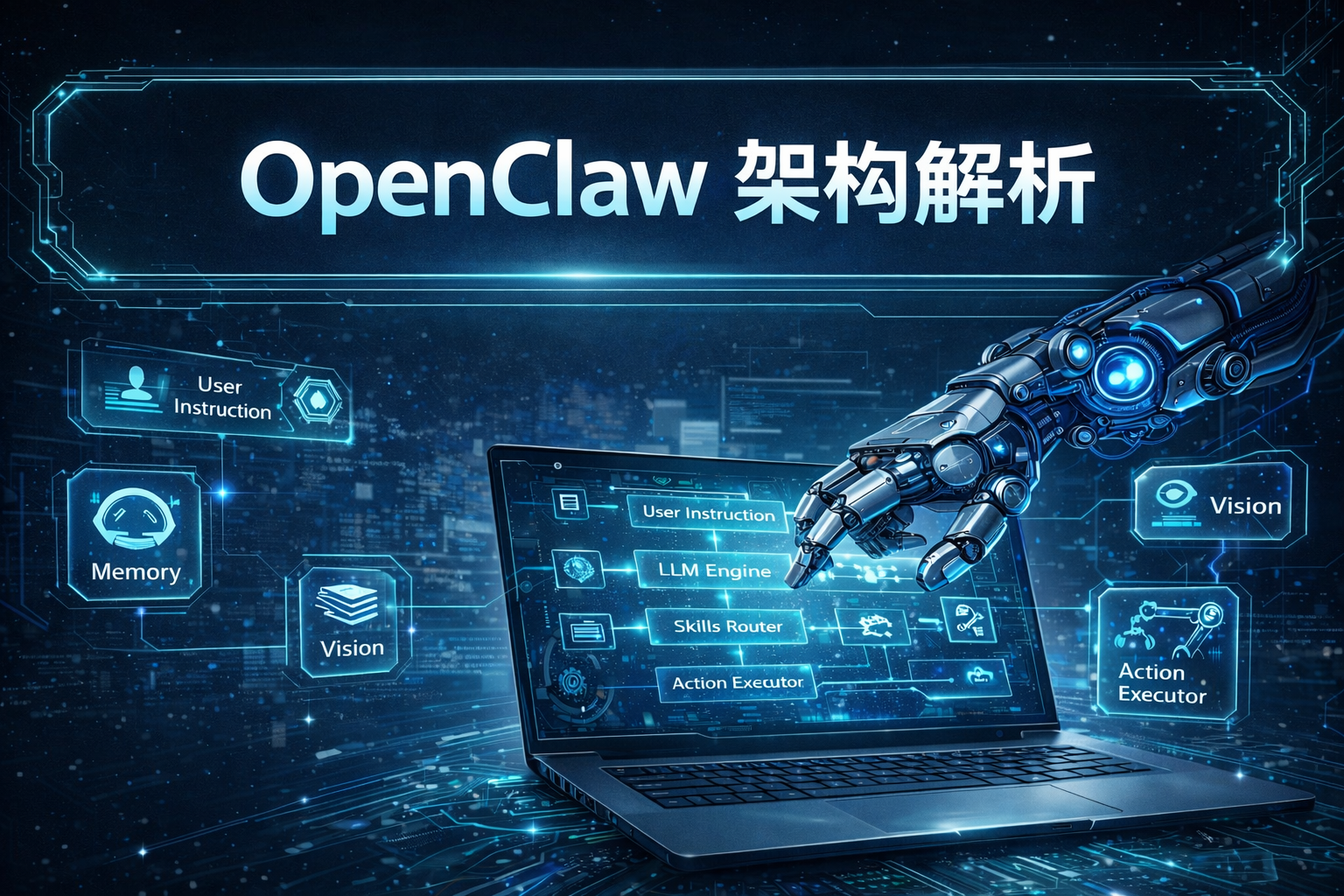 第一层是用户指令层,用户通过各种渠道下达任务指令;第二层是 AI 推理引擎,负责理解任务并制定执行计划;第三层是技能路由器,负责选择合适的技能来执行任务;第四层是动作执行器,将决策转化为具体的系统操作;最底层是操作系统,负责与硬件交互完成实际动作。