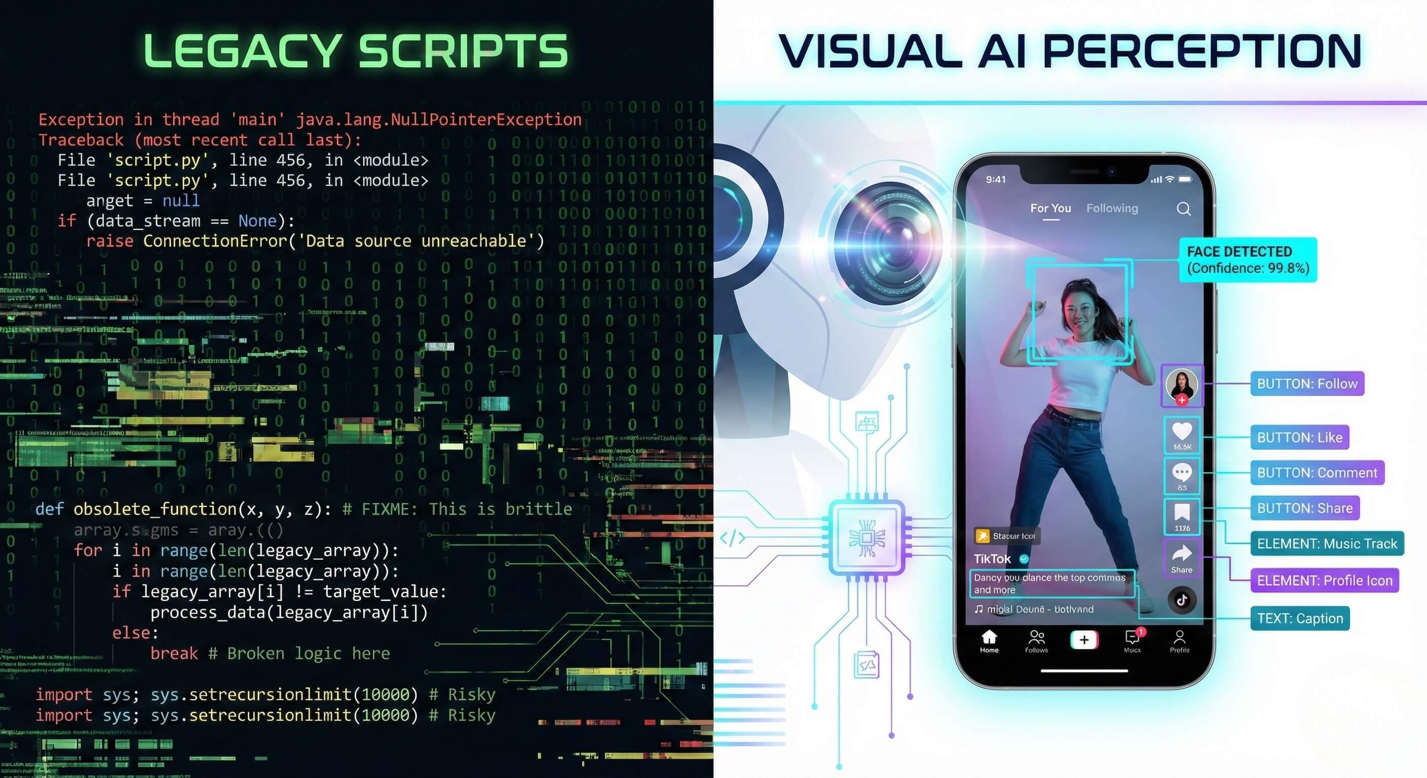 2. 使用传统脚本 (RPA/Script): 这是过去几年的主流。你写一段 Python 或按键精灵脚本,让它去点击屏幕。但脚本是"盲"的,一旦 TikTok 更新了 UI,或者弹出一个未知的验证码,脚本就会卡死甚至报错。