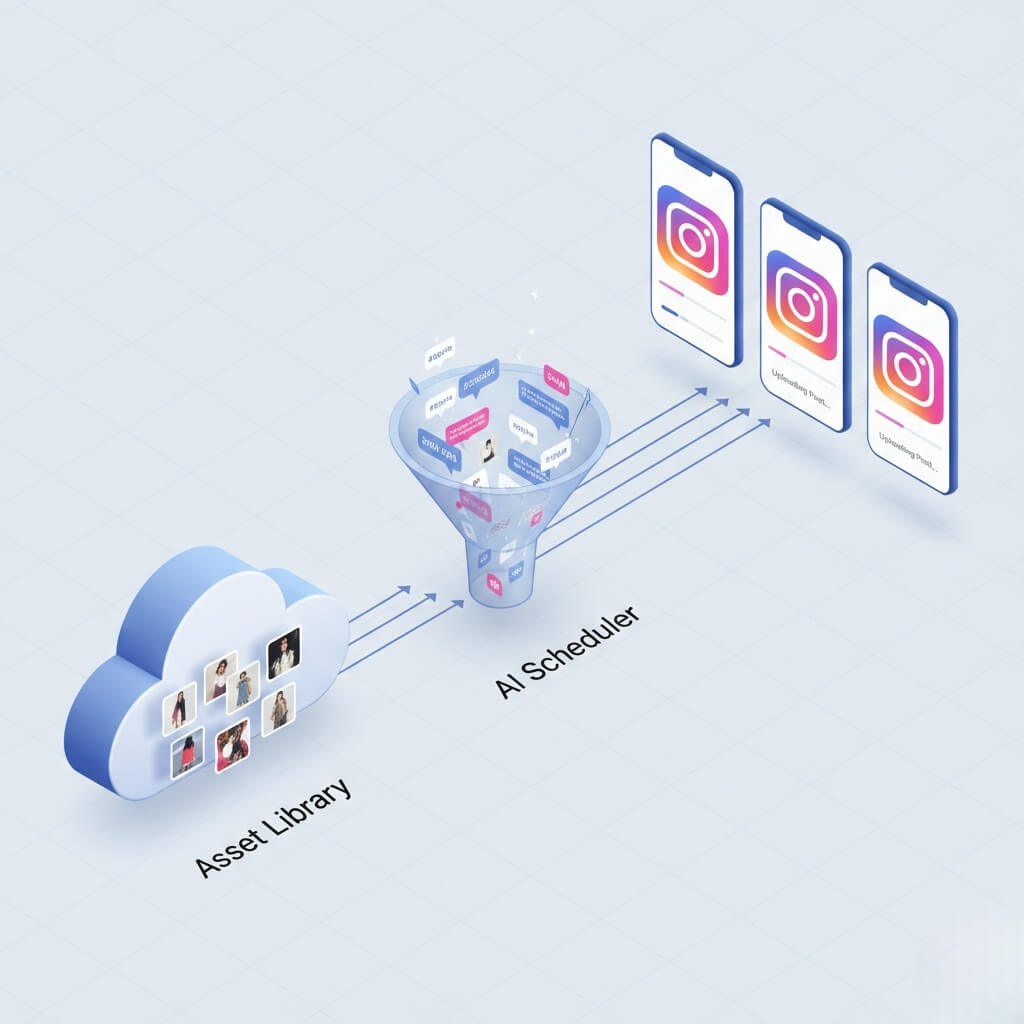 多号噩梦:你有 50 个账号(分发不同品类),每个号每天要发 3 张图。手动切换账号 -> 选图 -> 复制文案 -> 粘贴 Hashtag -> 发布。这套动作重复 150 次,熟练工也需要 6 个小时。