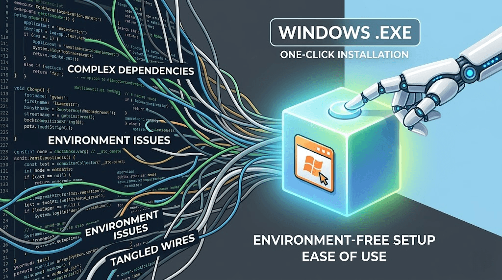 传统的 AI Agent 项目(如早期的 AutoGPT 时代)往往对小白非常不友好,安装过程堪比“渡劫”。对于 Windows 用户而言,最让人头疼的莫过于环境变量(Path)配置、C++ 编译工具链(Build Tools)缺失,以及各种 npm 或 pip 包的下载超时问题。