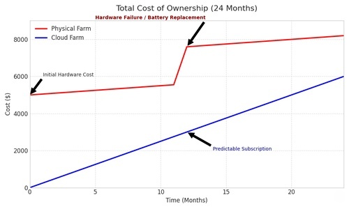 *Note: While Cloud OPEX appears as a monthly cost, the Total Cost of Ownership (TCO) is significantly lower when factoring in electricity, labor, and the 30% hardware failure rate typical of physical farms.