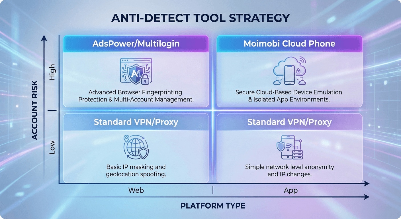 • The Limitation: Anti-detect browsers (like AdsPower) protect Web fingerprints (Cookies, Canvas). They cannot protect App fingerprints (IMEI, Gyroscope, GPS).
