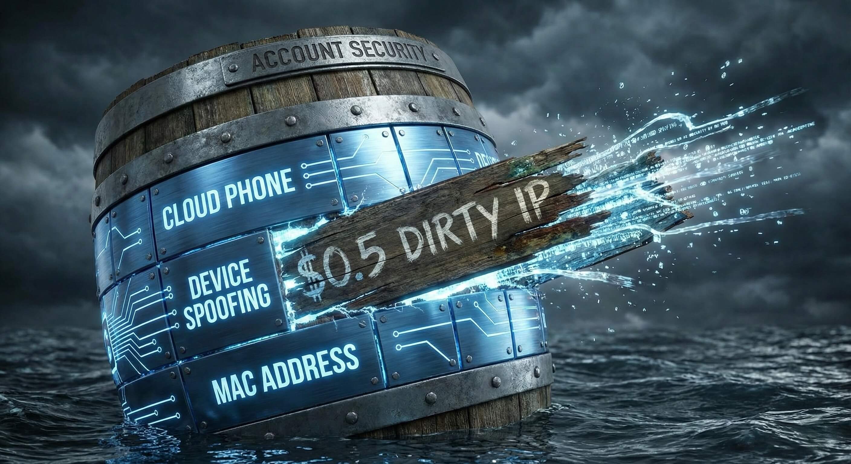 为什么?因为木桶效应。 在账号防关联的系统工程里,云手机(设备环境)是那块最长的木板,而劣质 IP(网络环境)就是那个漏水的无底洞。当你的网络节点是“脏”的,你精心搭建的设备隔离墙就成了一个笑话。