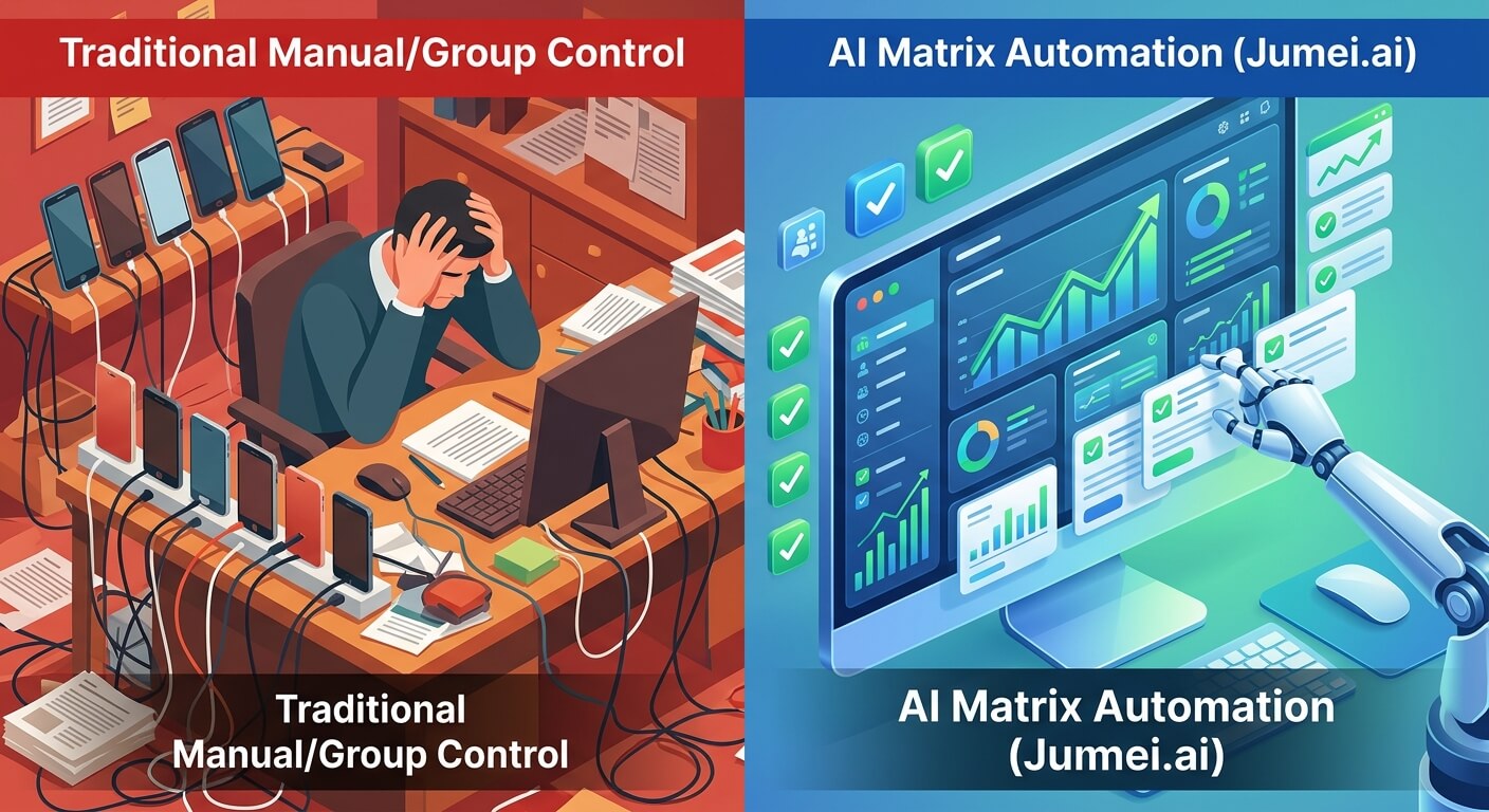 | 对比维度 | 手动运营团队 (Manual) | 普通群控/RPA脚本 | Jumei (AI 劳动力矩阵) |