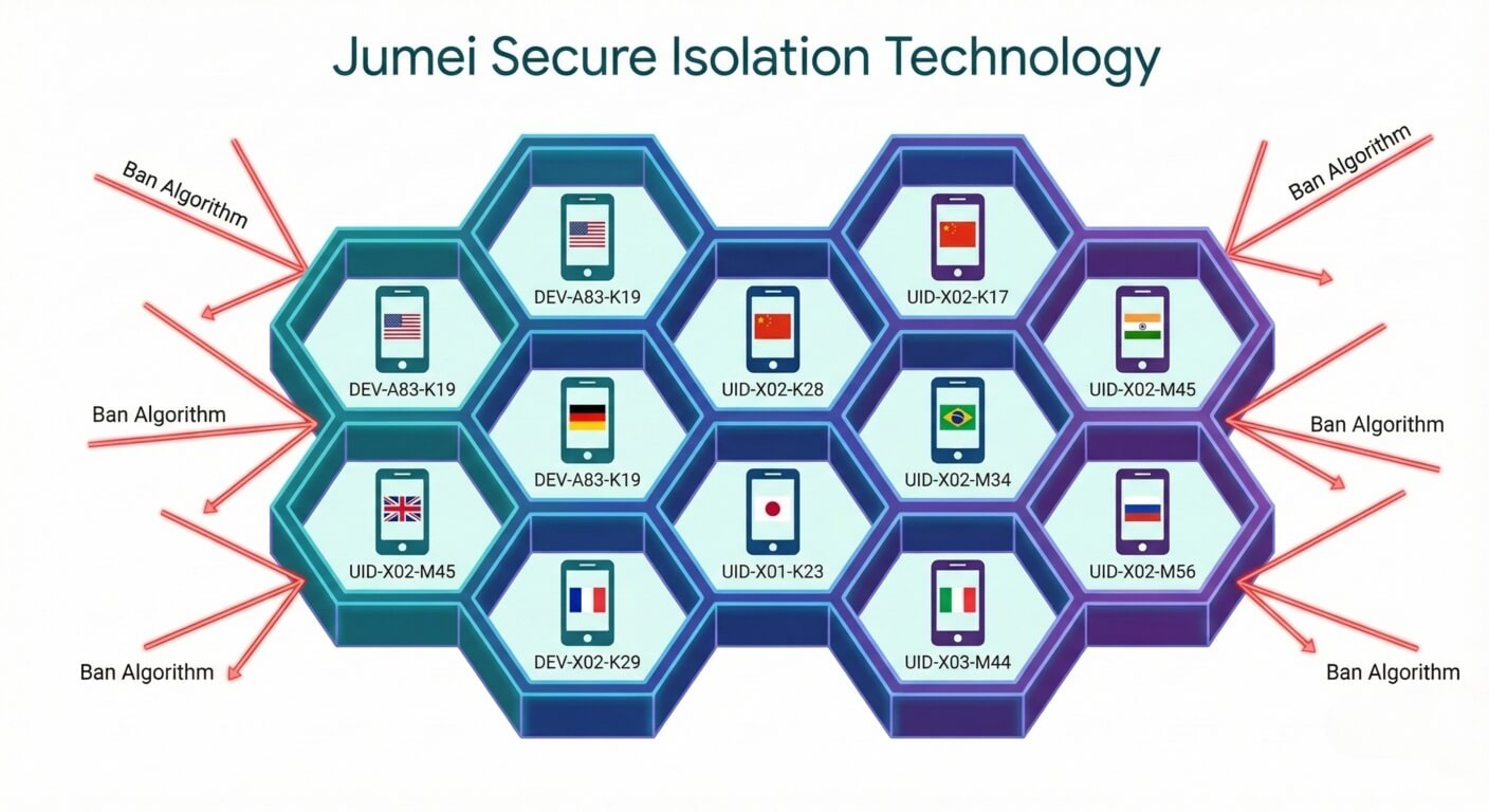 Jumei 云控:云手机运行在数据中心,但通过底层技术模拟了分散的 GPS 和基站信息。配合静态住宅 IP,在平台眼里,这些账号分布在纽约、伦敦、东京的千家万户中,物理距离相隔十万八千里。