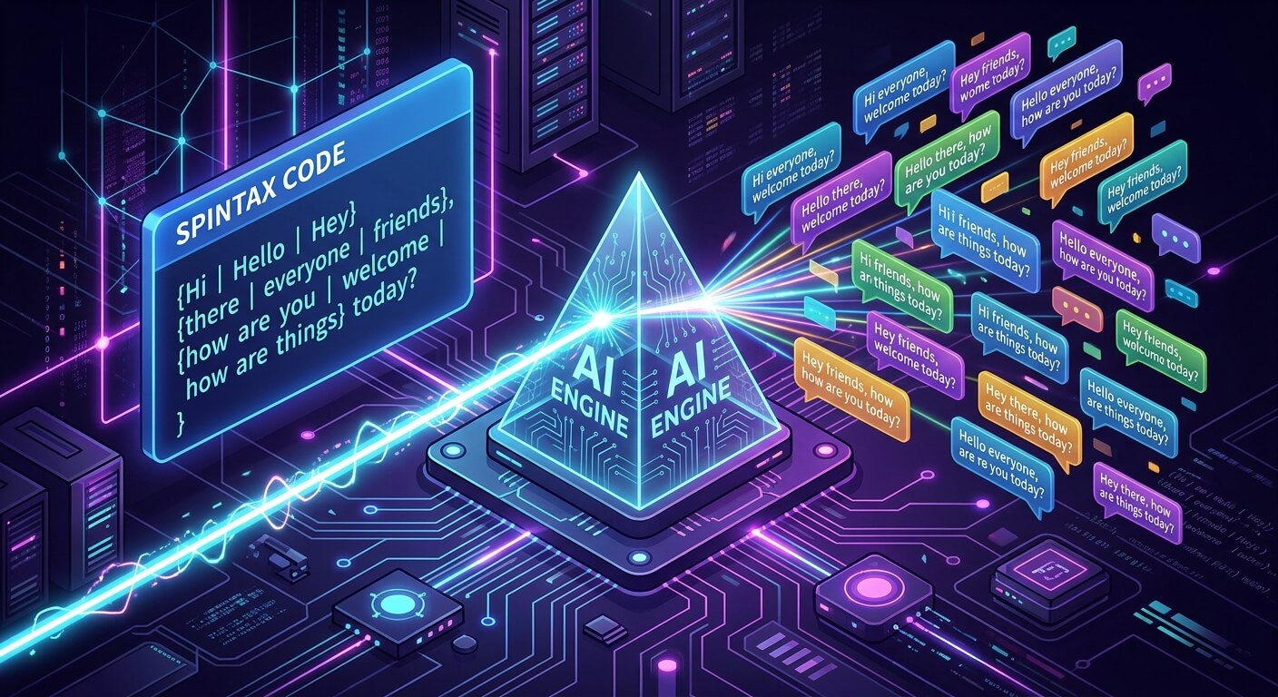 即使在安全的云手机中,如果 10 个账号给 100 个人发完全一模一样的文本,依然会被系统进行哈希值(Hash)降权。我们必须引入 Spintax(旋转文本) 技术。