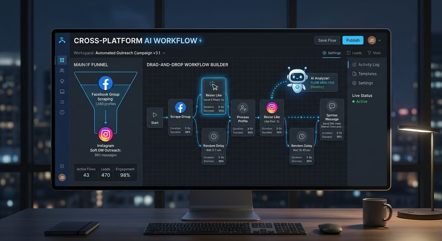 - 步骤三:破冰私信(Soft DM)。 延迟 2 小时后,AI 发送 Spintax 旋转话术。例如:“{Hey|Hi}! I saw you in the [FB 群组名称] group. Your {feed|photos} here on IG are {amazing|stunning}! Just wanted to connect with {fellow enthusiasts|like-minded people}.”
