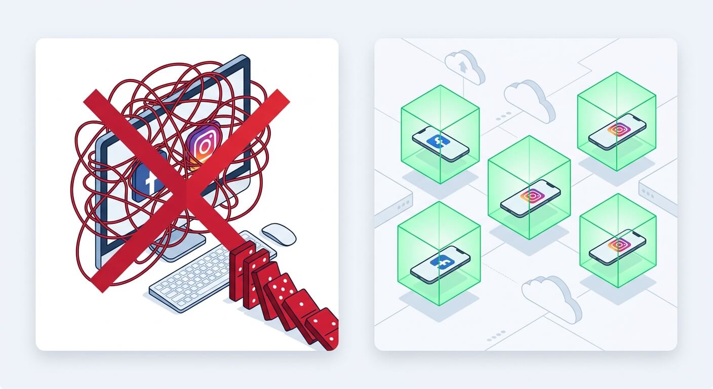 在 Meta(Facebook & Instagram 的母公司)的生态中,跨平台引流是一把双刃剑。打通双端确实能带来极高的用户粘性和无缝的社交体验,但同时也意味着您的风控风险被呈几何级数放大。
