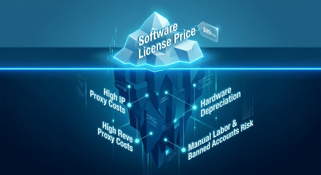 很多老板在采购海外社媒自动化运营系统时,只盯着软件本身的标价,却忽略了防封环境搭建所需的 IP 代理费、云手机租赁费以及后期极其高昂的人工维护成本。最终导致“买得起软件,却跑不起矩阵”。