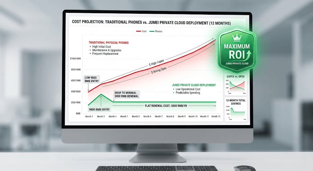 如果您有长期的社媒矩阵规划,我们强烈建议采用 Jumei 独创的 云机私有化部署解决方案。这是目前市场上 TCO(总拥有成本)最低的终极方案。