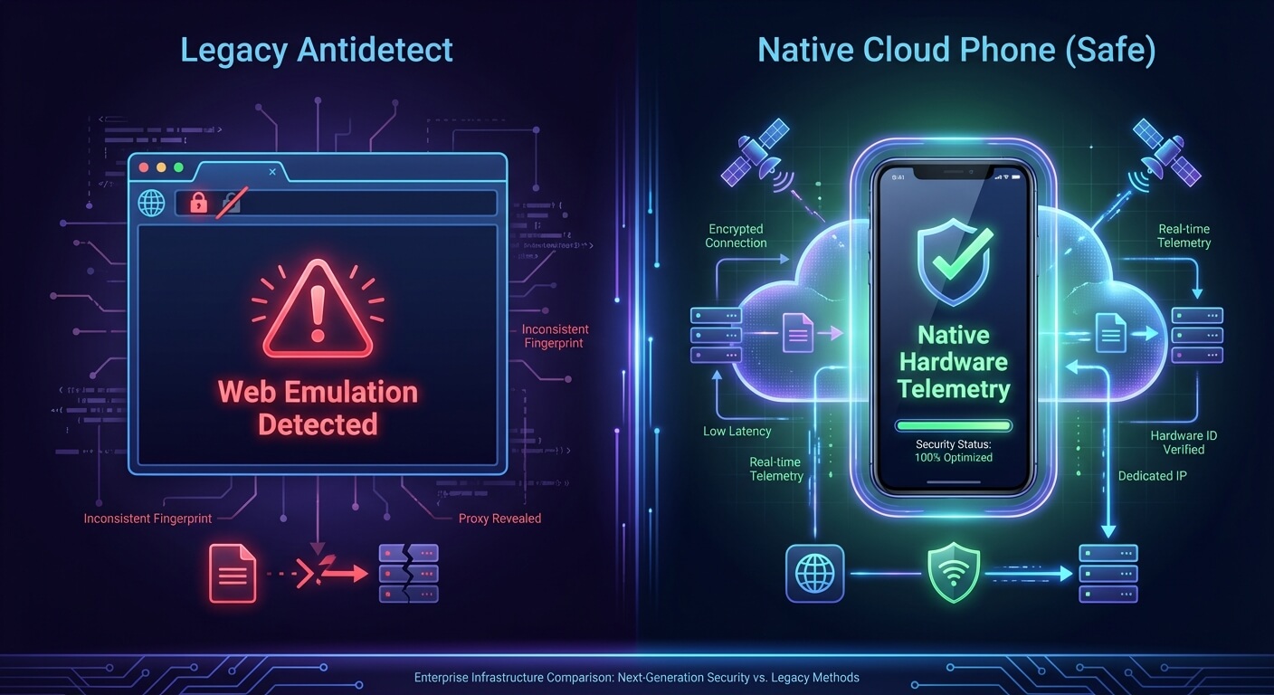 Can websites detect antidetect browsers? It depends on the quality of the browser and the sophistication of the website. Advanced platforms (like Facebook and Google) constantly update their scripts to detect inconsistencies in spoofed Canvas hashes or WebRTC leaks. This cat-and-mouse game is why many marketers prefer native Cloud Phones, which do not rely on spoofing.