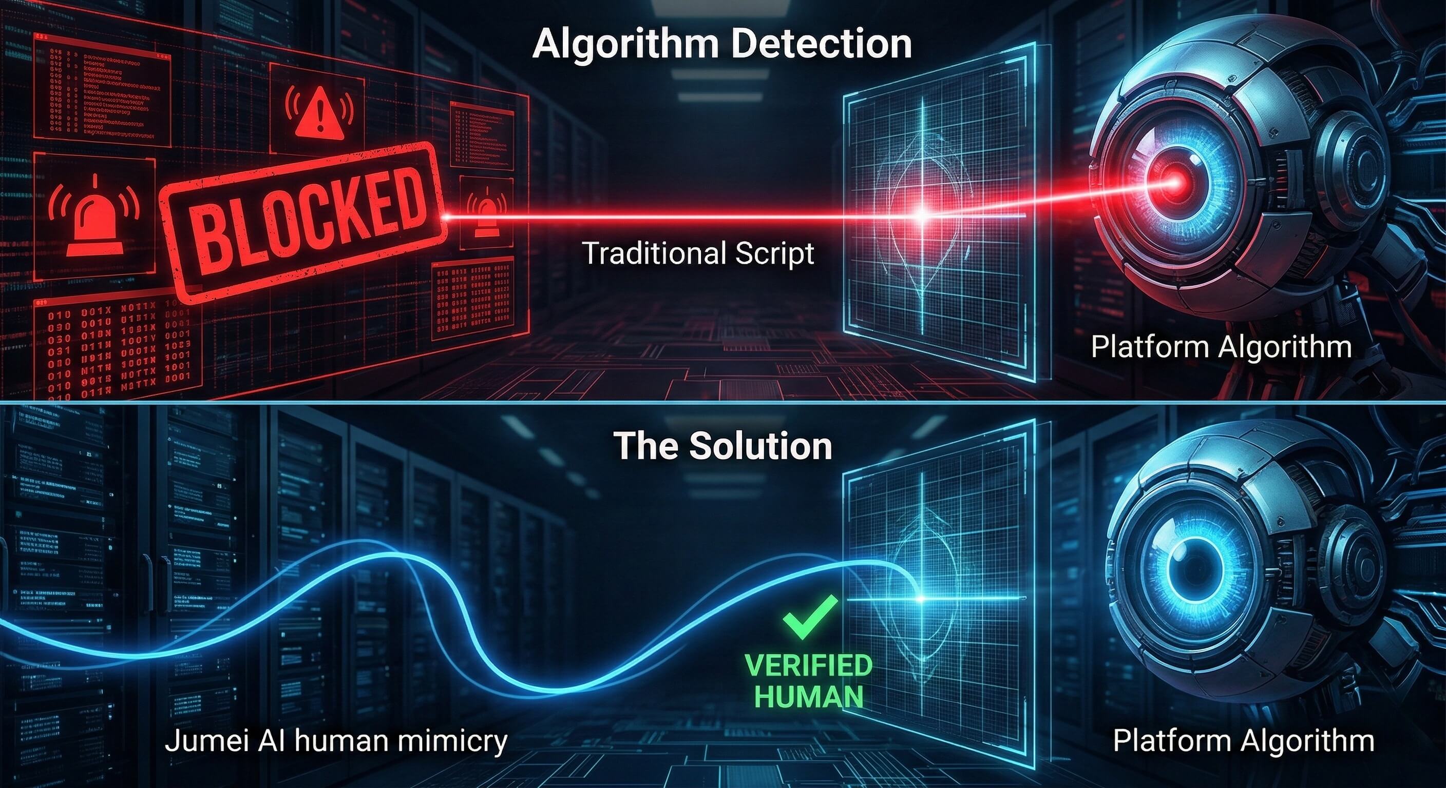 Q5:平台的风控还会升级,你们的技术会过时吗? A: 网络安全永远是“道高一尺,魔高一丈”的动态博弈。传统的工具之所以过时,是因为它们的架构太死板。Jumei.ai 的核心团队持续监控各大平台的 SDK 更新和风控模型变化。我们的云端架构允许我们在服务端实时下发新的底层对抗补丁和行为模型更新。用户无需下载任何更新包,即可时刻保持最前沿的防封能力。
